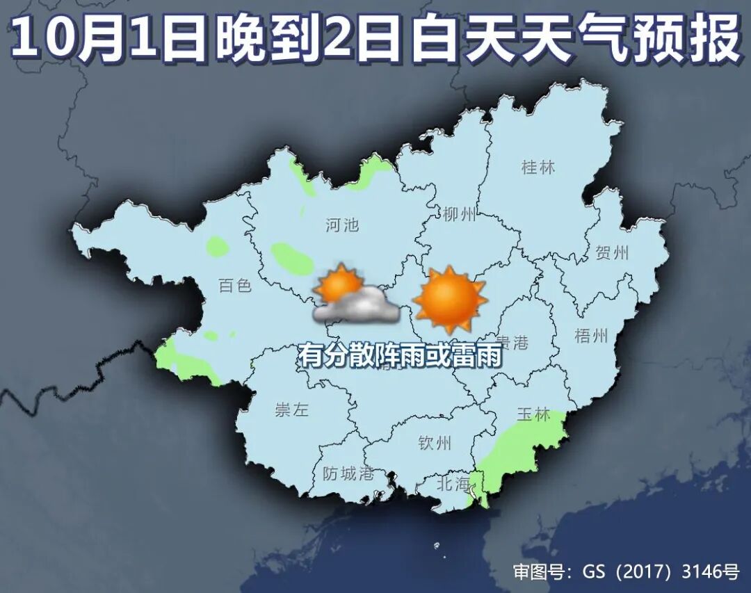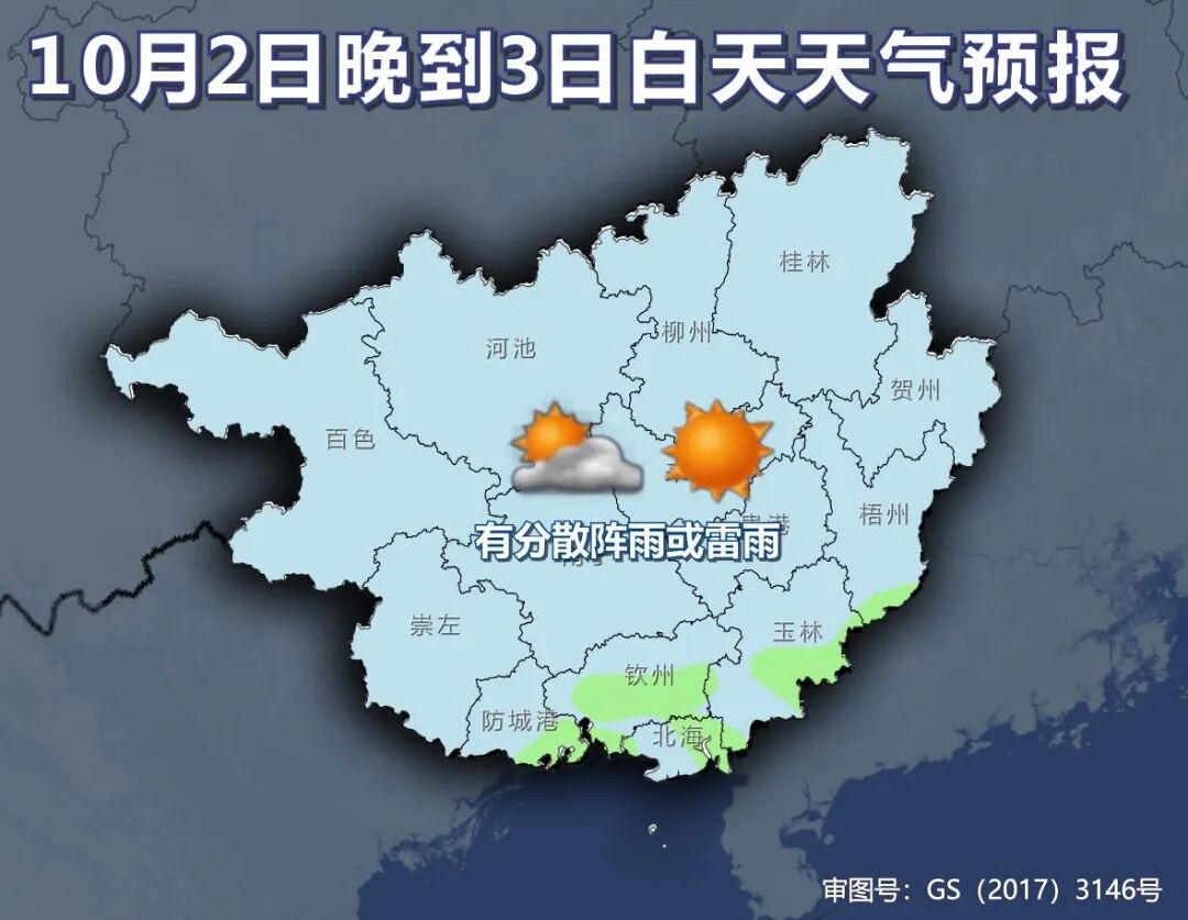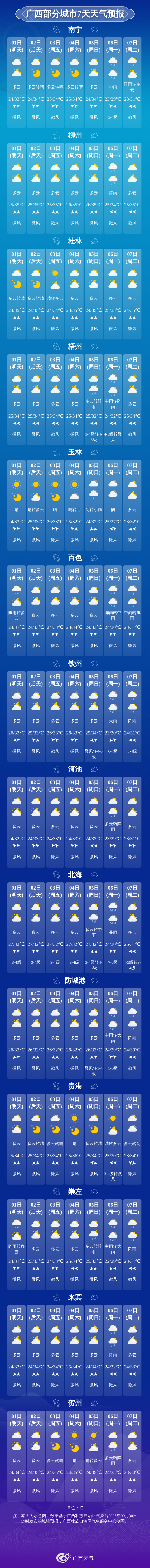 今日晚上到明日白日,百色、崇左、防城港、河池等市多云有阵雨或雷雨、局地大雨,其它区域多云、局地有阵雨或雷雨。